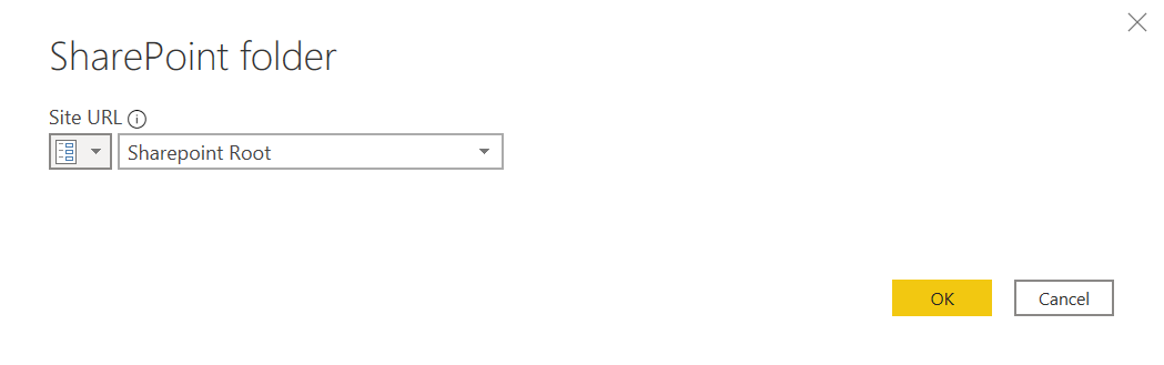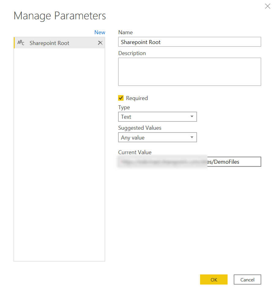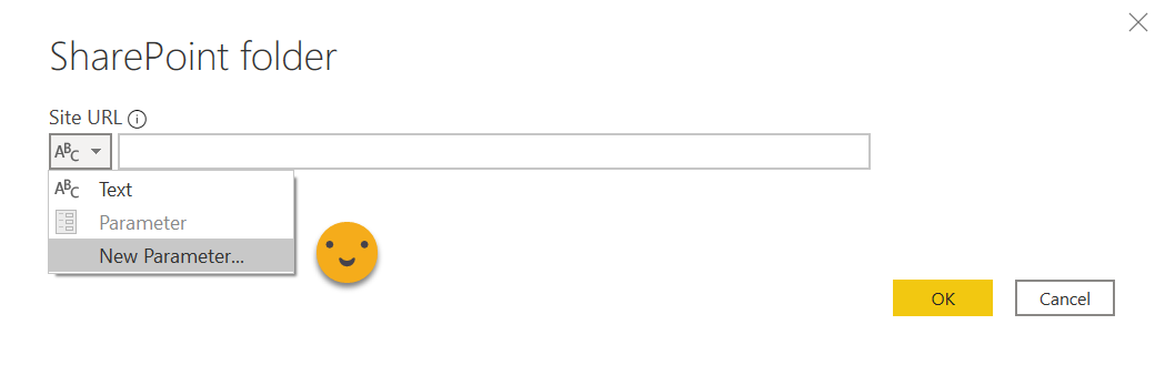 This will get handy in a minute. When we finally go to add new source –> sharepoint folder, now we can specify the URL from a parameter. Since we do not have any parameter with the URL we want to use we just go to «New Parameter» …