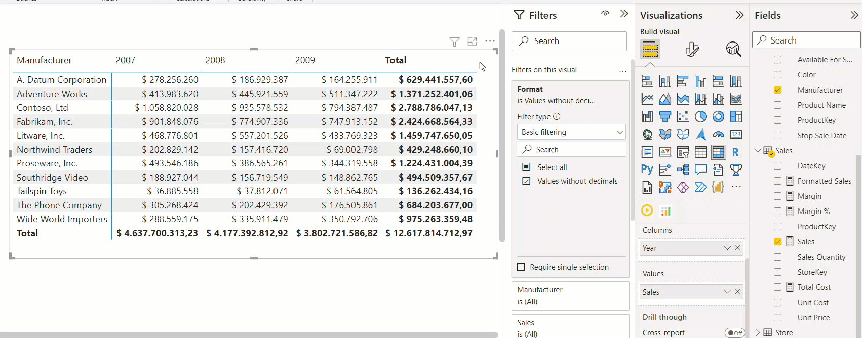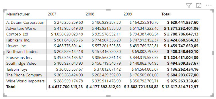 If we work in an evil corporation that allows no external tools, we’re stuck with a workaround to achieve this dynamic format string we need. We’ll use Contoso model as usual, and we can use [Sales] as our base measure. In our Matrix we are using the Manufacturer and Year as slicing dimensions.