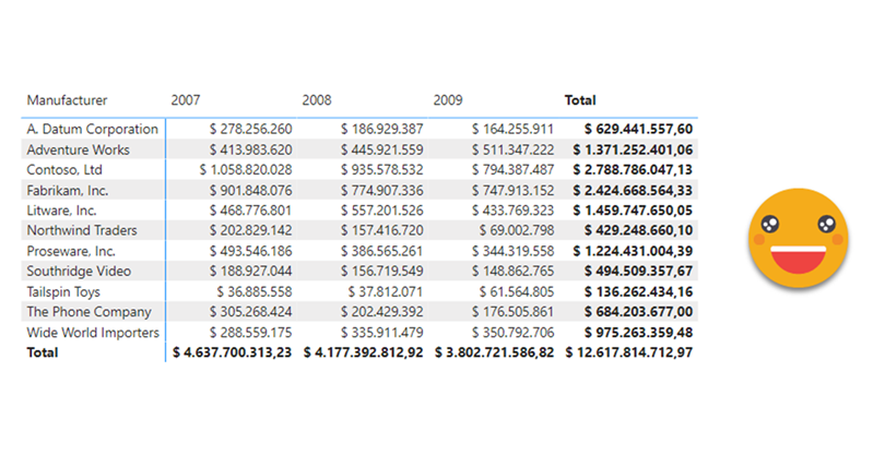 As we can see, the measure approach is a terrible idea. We are getting an empty string for years without sales and the numbers are left-aligned. The first problem can be solved with a litte more dax, but solving the second one looks like a terrible headache. The closest you could get would be by using a constant-width font (which may already be a no-go in many situations), count the maximum length including values and totals (which is not easy, especially because we have different formats) and then play with spaces in the front to make it look like it’s a number. Still everything will be left aligned because it’s still text, but you can fool yourself, but most likely nobody else will fall for it and will say that the matrix looks odd.