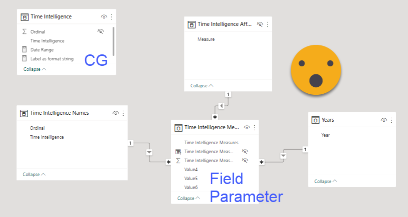 To use this field parameter you might want to build the filter tables for the slicers you saw on the video on top. For that I reused the table of «Time Intelligence Affected Measures» which already contains the names of the measures we are using (most likely). Now for calculation items you can’t just create a relationship with the calculation group, so you might want to create a calc table that is equal to the calc group table. It will contain just the names, but none of the wizardy, so it’s great as a dimension containing all the calc item names. You could enrich that with a nicer names of course. Finally for years you will probably need to a year table. With that you can build like a star schema around your field parameter — how cool is that?