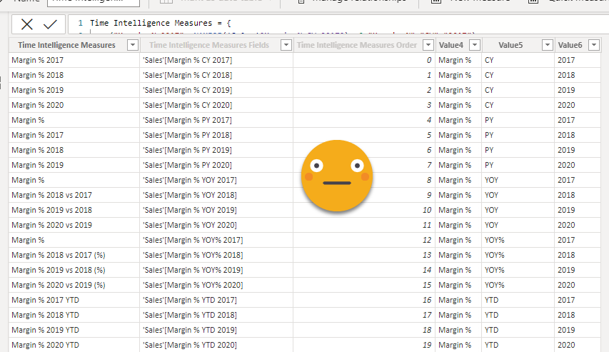 The third building block is this other blog post. Here I built on the previous blog post and went one step further: After creating all the measures using the calculation group, I created a Field Parameter with two extra columns, one with the base measure name and one with the calculation item name. The Field parameter created by the script looks like this: