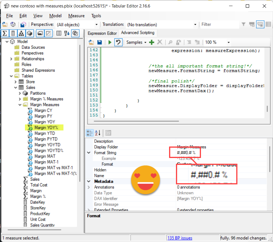 Then there is another important building block that I laid out in this other post, a C# script that given one or more measures and a calculation group it will create the measures for each calculation item, and with the appropriate format string. This last part is trickier than it sounds, since with calculation items you have to evaluate a DAX expression in order to get the format string that will be applied. As a recap, it creates an auxiliary calculation group that as a value expression that is just SELECTEDMEASUREFORMATSTRING() so this way you can extract the resulting format string of any measure even after the application of one or more calculation groups. The script creates a value expression using a CALCULATE and applying the calc item, and for the format string evaluates the same CALCULATE expression with the extra calc group on top so the format string is returned and used as the now static format string. This technique will be used again in today’s script. Check the blog post for details.