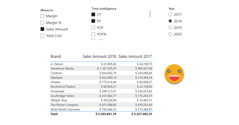 Margin YOY 2020 = CALCULATE( [Margin], 'Time Intelligence'[Time Intelligence] = "YOY", KEEPFILTERS( 'Date'[Year] = 2020 ) )
