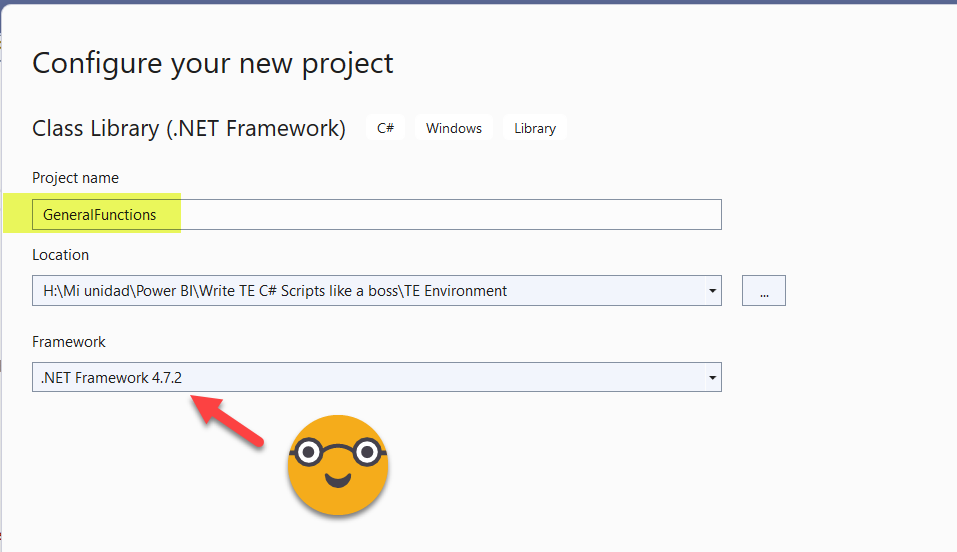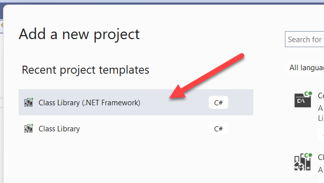 Now we need to select the exact same thing we did for our coding environment project, so «Class Library (.Net Framework)» is the way to go