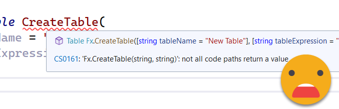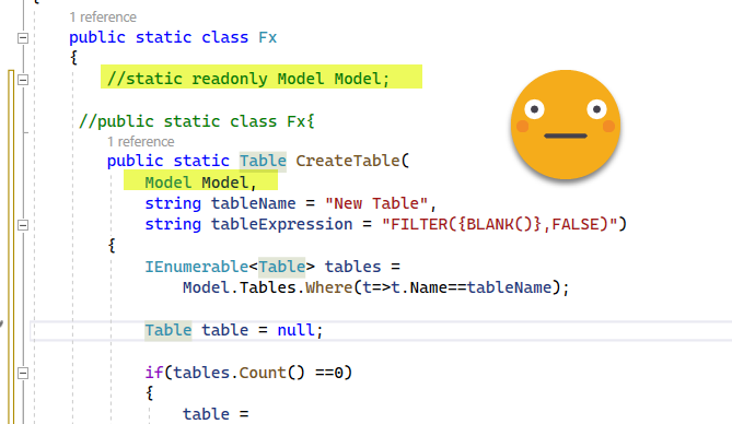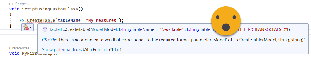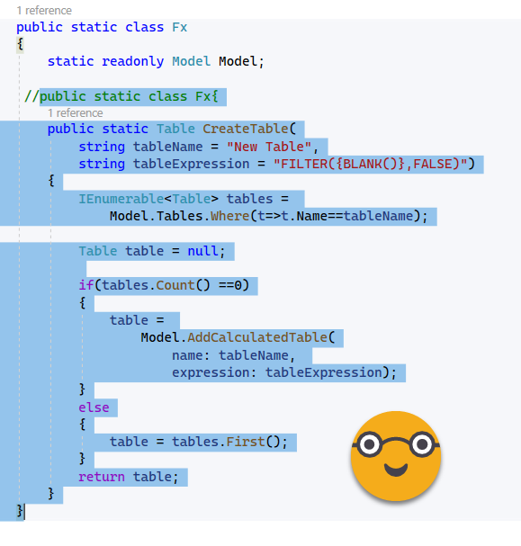 Obviously, if we try to execute just that we get the error message «The name ‘Fx’ does not exist in the current context.». Fair enough. So now it’s time to copy-paste our Fx class. Just the class, not the entire namespace. However, now we see some problem… We do not want to copy the Model variable because this will certainly cause problems on the Tabular Editor’s side. If we write also our functions for Output, Error and so on to avoid the ScriptHelper shenanigan, we get more and more code that we’ll have to remove each and every time. Unless we do something sneaky…