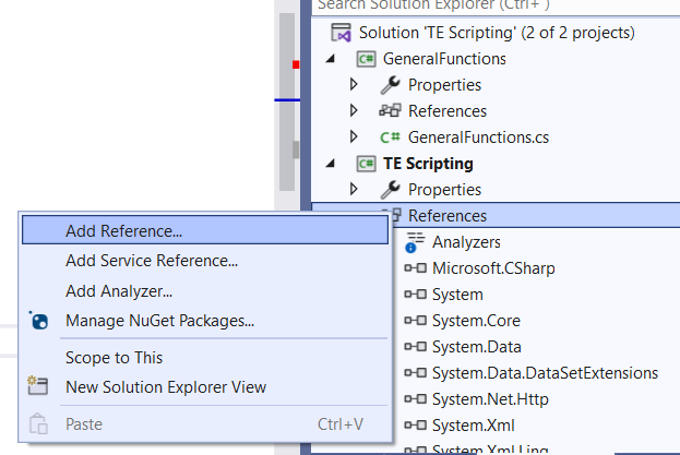 Right now though we are on a mission to show how to make this class work for us. This method is fairly simple, but once we get creative we might put in a lot more optional parameters, so we really need intellisense. So, now it’s time to go back to the ‘coding environment’ project, the place where we’ll actually write the scripts, and add a reference to our new project, the project where we just created the method. To do that, right-click on the ‘coding environment’ project name > Add Reference