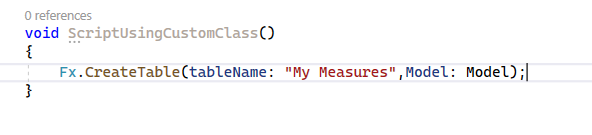 [code language=»csharp»]Table measureTable = Fx.CreateTable(tableName: "My Measures",Model: Model);
