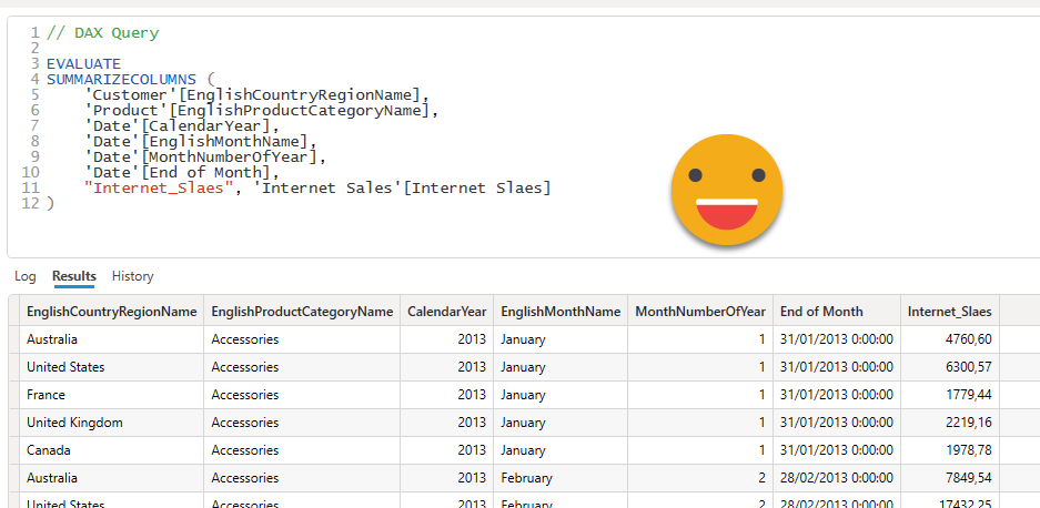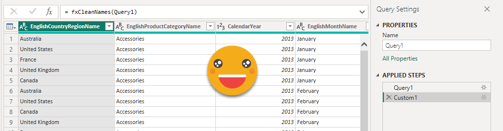 Step 9: The result of the query from step 6 should now be a table of your new model. Headers of DAX queries come with table prefixes and ugly square brackets. Clean these up with some power query before you load them into the model. Since you’ll have to do it for all tables, you might as well use a function fxCleanNames, defined as: