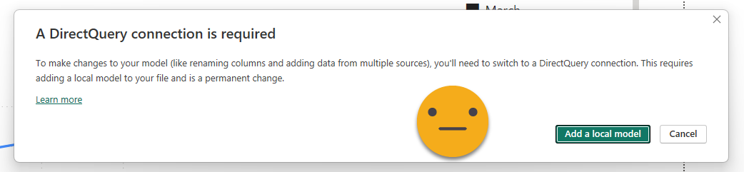 So, on the plus side, with DirectQuery approach you are reusing the logics of the original model, and since it’s direct query you don’t have to worry about orquestrating refreshes. Also you are not limited to datasets of a single workspace, but of course anyone who should be seeing the report needs at least read permission of all the remote models, so keep that in mind. In DirectQuery performance can easily be bad or terrible if you add local tables filtering the remote islands, or create relationships between islands, but they also have another shortcoming: Reports do not render if consumed through an embedded capacity. Not a report I built personally, but I saw the problem first-hand. So I’m not saying there is no use case where this might be the best approach, but really, don’t.