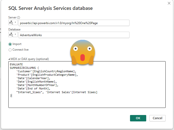 Step 8: For server, use the XMLA endpoint of the workspace where the source dataset is stored. For database use the name of the source dataset. Under advanced options, paste the DAX Query from Step 6.