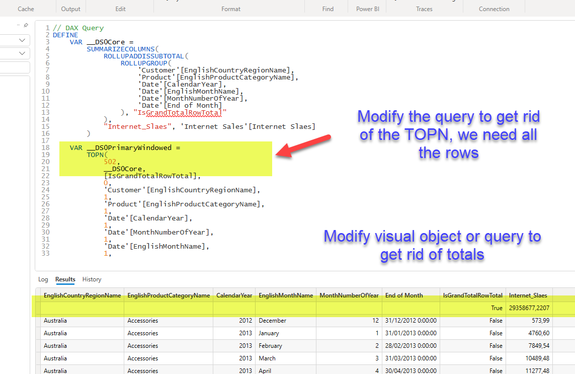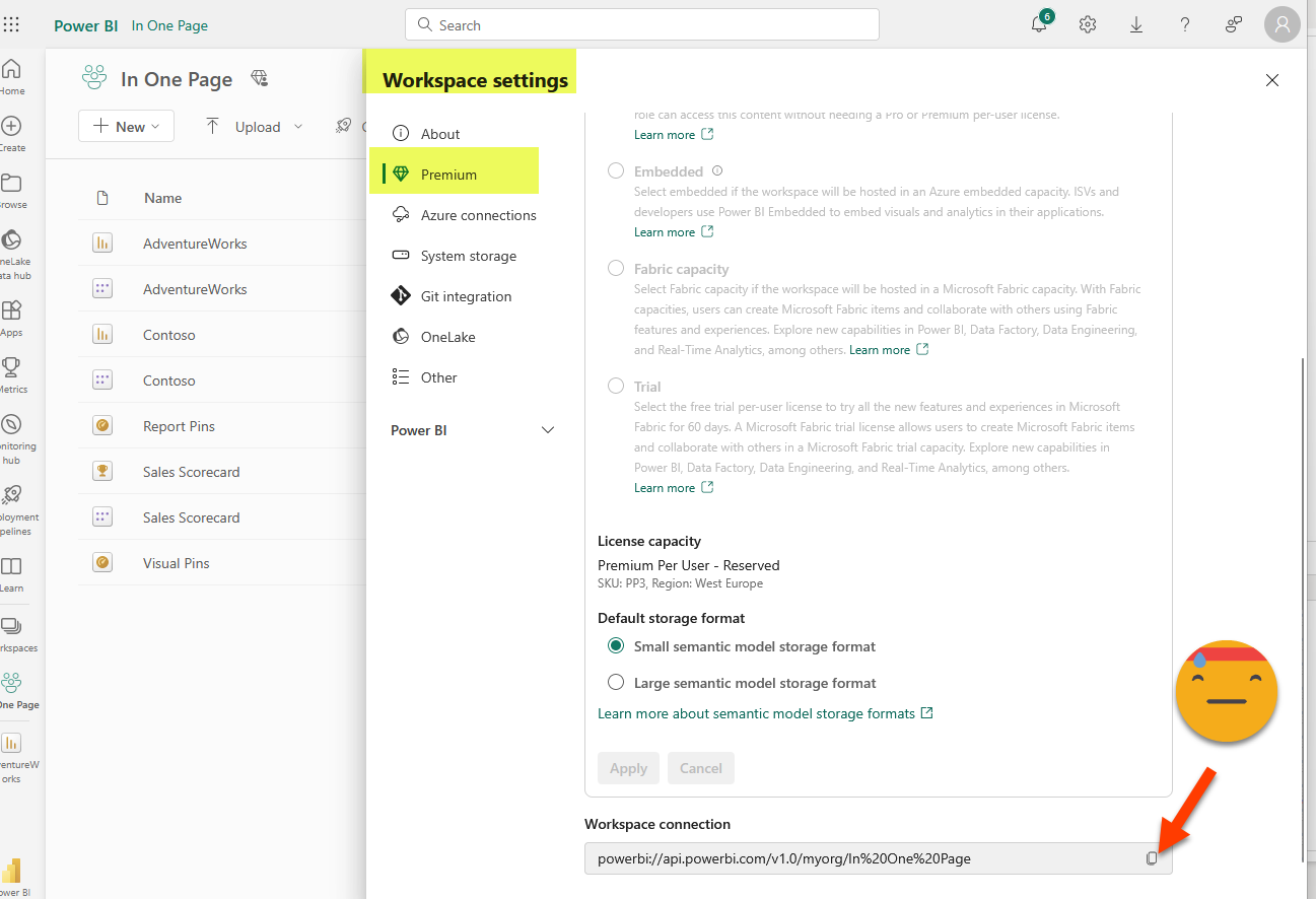Step 6: Either copy the query into DAX studio (or open it in the Query view: not available yet in thin reports). Confirm that using the result of the query as source data, you can build the visual object you need. You might need to modify the query to avoid having total rows. To connect to the model from DAX studio you’ll need the XMLA endpoint. You’ll find it in the workspace settings, under «premium» at the very end.