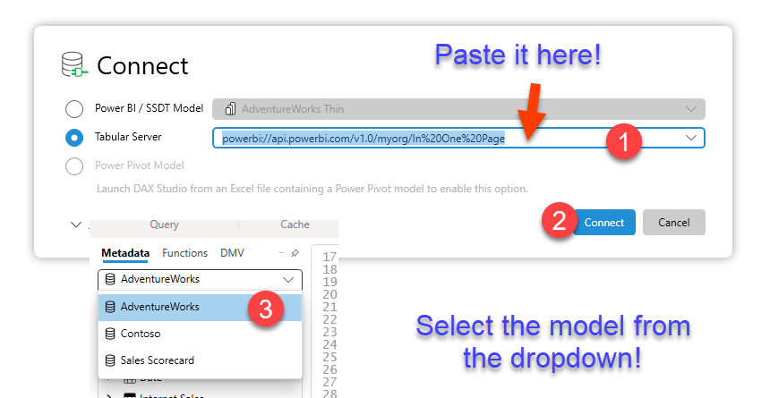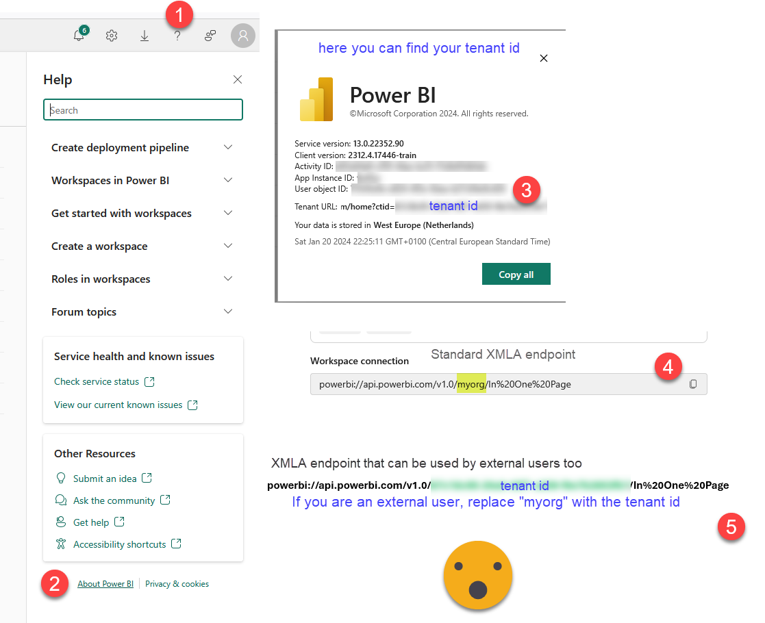 If you happen to be a guest user on the tenant where the source dataset is stored, make sure to modify «myorg» in the XMLA endpoint with the tenant id of that tenant. You can get it by clicking on the question mark on the top right in Power BI Service, then going to the very bottom on «About Power BI» and you’ll find the id at the end of the «URL of the tenant»