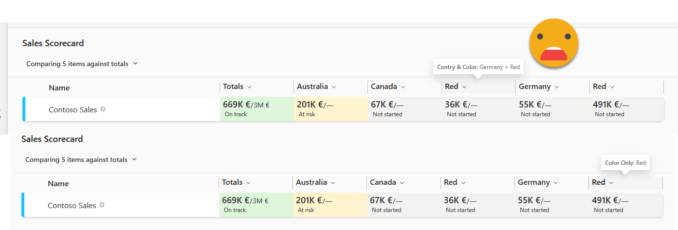 Information density was a problem. Normally you just don’t follow a KPI per se, you follow a KPI across one or more dimensions, like Sales per country, or per store, or per product category and so on. When I tried scorecards for the first time (when they were called «Goals») the only way was to create n KPIs, each from the same measure but with a different filter. Now you can define one or more hierarchies built by columns of the model (I wonder what it does if you have different models…) and from there you can use the hierarchies to either filter the values of the scorecard, or to build a heatmap where you end up seeing sort of a matrix, sliced by the selected levels of the hierarchy. From what I’ve seen though more than one level of the hierarchy does not display in a way that makes it easy to understand that is being filtered by 2 dimensions. In the image, the first «Red» represents Red product sales in germany, the second Red is the total Red product sales. Pretty much impossible to tell without showing the tooltip, and not customizable at all.