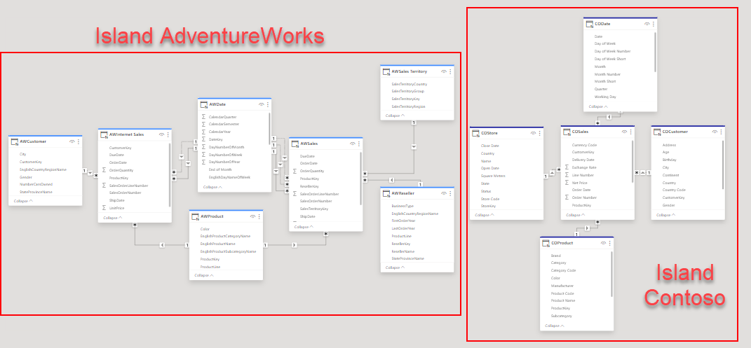 So we have them somehow in the same place, but now what? One option is to build the visuals using only tables from the same model. That will make the performance be less bad, since at least all the values will be calculated on the same place. But what if you want to put some common filters, such as Date? One terrible option is to start creating relationships between tables of different islands. Don’t do it. Another is to create some local tables that will filter both islands, but that might be a bit tricky too if the tables are not coming from the same original table. In any case do not add any more granularity than you need in this local tables. If you just need to slice by brand, don’t bring the product Id on the local table, the key here is to try to limit the size of the filters traveling back and forth.
