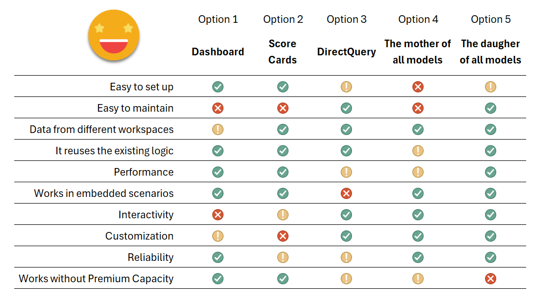 Wait what? Yes! «The daughter of all models». This is the option I really came here to talk about but ended up doing a full article on the different options. The idea is: Instead of building from scratch a model that includes all the data from separate models and needs to replicate all the logic, we can build a model that brings some aggregated data using the original measures of the different models, just enough to build the high-level visuals. For this we’ll need premium capacity on the workspaces where the different data models are stored, but with Premium Per User and the new fabric capacities that’s not such a tall order as it use to be (fabric = premium).