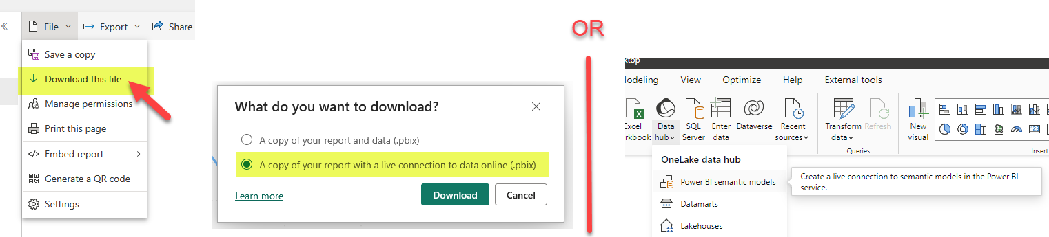 This is a very recurring topic. You carefully build a dataset semantic model for each business process, and when it all looks good in your Power BI App, some top brass requests a top level summary with key visuals from pretty much all the different models. And they ask for it like for tomorrow. What is to be said? In this post I want to go over the different alternatives, each with pros and cons. Some with fewer pros than cons, but still. At the end I’ll present an alternative when the standard options don’t make the cut. Let’s get started.