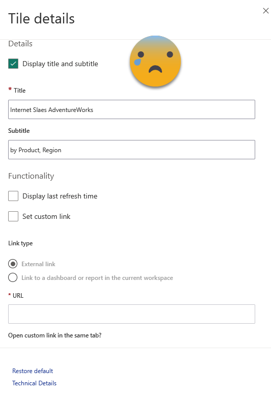The problem? For starters, the configuration options are rather limited in general. Particularly if you resize things, there are rather large steps on size, so chances are that you will not find a size that suits you. Also, you can’t change any of the formatting of the charts directly, so you’ll have to prepare them in the original report and hope for the best or try your luck through the Dashboard theme thing. Manually for each tile you can change only the text of title, subtitle, show the refresh time (even though this one does not seem to reflect the truth on my end at least) and change the link. Forget about fonts, size, colors etc. By default the link brings you to the same visual but inside the report. At best you land on a page that offers some more detail or possibilities to drill through or filter the data.