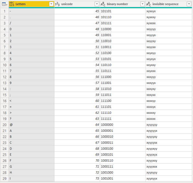 let Source = { "-" .. "z" }, #"Converted to Table" = Table.FromList ( Source, Splitter.SplitByNothing(), null, null, ExtraValues.Error ), #"Renamed Columns" = Table.RenameColumns ( #"Converted to Table", { { "Column1", "Letters" } } ), #"Added Custom" = Table.AddColumn ( #"Renamed Columns", "unicode", each Character.ToNumber ( [Letters] ) ), #"Changed Type" = Table.TransformColumnTypes ( #"Added Custom", { { "unicode", Int64.Type } } ), #"Added Custom1" = Table.AddColumn ( #"Changed Type", "binary number", each #"number to binary" ( [unicode], 2 ) ), #"Changed Type1" = Table.TransformColumnTypes ( #"Added Custom1", { { "binary number", type text } } ), #"Duplicated Column" = Table.DuplicateColumn ( #"Changed Type1", "binary number", "invisible sequence" ), #"Replaced 1 with zero width space" = Table.ReplaceValue ( #"Duplicated Column", "1", #"zero width space", Replacer.ReplaceText, { "invisible sequence" } ), #"Replaced 0 with zero width non-joiner" = Table.ReplaceValue ( #"Replaced 1 with zero width space", "0", #"zero width non-joiner", Replacer.ReplaceText, { "invisible sequence" } ) in #"Replaced 0 with zero width non-joiner"