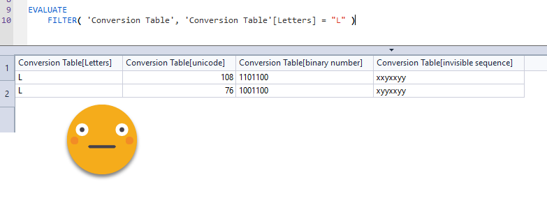 Maybe not — putting together snippets from Phil Seamark @PhilSeamark and Owen Auger @Ozeroth from this tweet I put together a DAX query that encodes any string into a binary sequence of 0-width characters and then decodes them back to regular letters! Is it useful? not really. Is it cool? you bet!