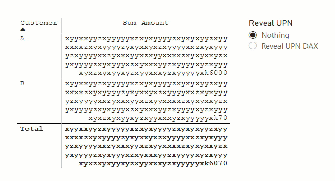 Reveal UPN DAX = VAR zeroWidthJoiner = UNICHAR ( 8204 ) VAR zeroWidhNonBreakingSpace = "k" //UNICHAR(65279) VAR valueWithUPN = SELECTEDMEASURE () VAR hiddenLettersLength = FIND ( zeroWidhNonBreakingSpace, valueWithUPN, 1, -1 ) VAR visibleValue = IF ( hiddenLettersLength = -1, valueWithUPN, RIGHT ( valueWithUPN, LEN ( valuewithupn ) - hiddenLettersLength ) ) VAR hiddenLetters = LEFT ( valueWithUPN, hiddenLettersLength ) VAR prefix = IF ( hiddenLettersLength <> -1, CONCATENATEX ( GENERATE ( GENERATESERIES ( 1, hiddenLettersLength - 1, 8 ), VAR currentChunk = MID ( hiddenLetters, [Value], 7 ) VAR letter = CALCULATE ( SELECTEDVALUE ( 'Conversion Table for DAX'[Letters], "$" ), 'Conversion Table for DAX'[invisible sequence] = currentChunk ) RETURN ROW ( "Letter", letter ) ), [Letter], "", [Value], ASC ) ) RETURN prefix & visibleValue