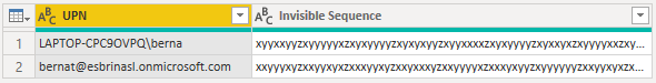 let Source = Table.FromRecords ( { [ UPN = "LAPTOP-CPC9OVPQ\berna" ], [ UPN = "bernat@esbrinasl.onmicrosoft.com" ] }, type table [ UPN = text ] ), #"Added Custom" = Table.AddColumn ( Source, "Letters as list", each Text.ToList ( [UPN] ) ), #"Added Custom1" = Table.AddColumn ( #"Added Custom", "Invisible Sequence", each List.Accumulate ( List.Buffer ( [Letters as list] ), "", ( status, current ) => ( if status = "" then "" else status & #"zero width joiner" ) & #"letter to invisible binary sequence" ( current ) ) ), #"Added zero width joiner in the front and back" = Table.TransformColumns ( #"Added Custom1", { { "Invisible Sequence", each _ & #"zero width non-breaking space", type text } } ), #"Removed Columns" = Table.RemoveColumns ( #"Added zero width joiner in the front and back", { "Letters as list" } ) in #"Removed Columns"