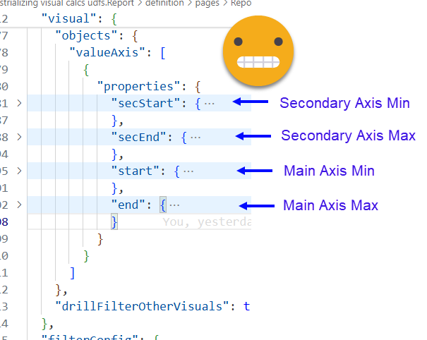 So everything is underneath Visual –> Objects –> valueAxis (which is a 1 element list?? not sure what else could be in there) and then again a big object with many properties which in turn have other properties. Oh well, let’s do it.