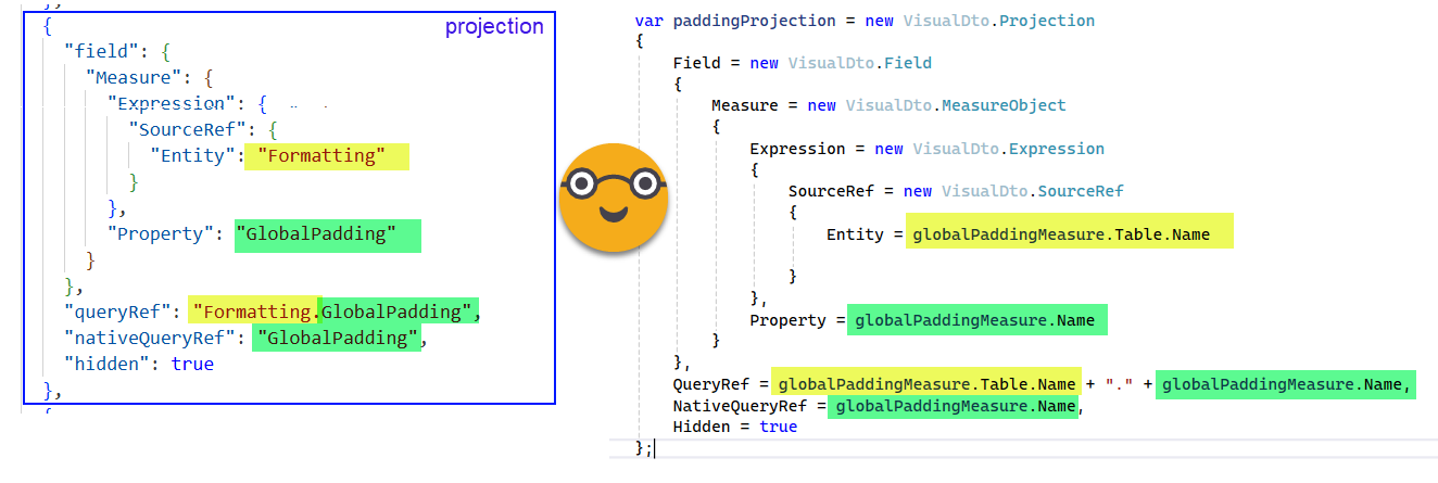 In this case we know we have the three queryStates we checked earlier (categories, y and y2). And we just need to add a couple measures and 3 visual calcs. Needless to say, the best way to know what you need to do is to do it first manually and have a look at the visual.json. Ok, we need to add everything to the querystate y (Columns in the UI). Since Projections is a list of the object Projection, we’ll first create the different projection objects and then we’ll add them all to the list.