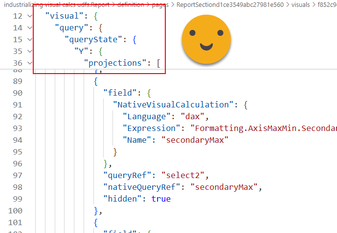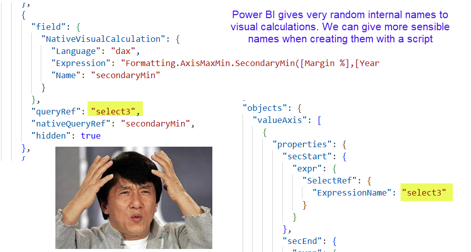 Just a couple more comments about this piece of code: I want a slow applause for the case-sensitive system that somehow ended up with «dax» in lowercase. Seriously. And also, in the script we give the visual calc a sensible «QueryRef» name, but Power BI if you do it manually it will call them like «Select1», «Select2» and so on. Very, very weird. And for some even weirder reason is this QueryRef (and not NativeQueryRef ) what is used when you select a visual calc on the max value for the axis. So many questions. It’s a fun exercise of reverse engineering though.
