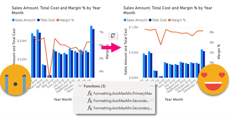 So after we make sure the preceding objects exist, we initialize our valueAxisProperties variable and start defining the different objects as we saw we need in the visual.json of the manually modified combo chart. Looking at it you see that the axis max and min can be set up in three different ways, one is this «SelectRef» which corresponds to the «Data in this visual» elements, that’s why we can use visual calcs there too. Then of course we can hard-code the max or min values. In this case we hard-coded the minimum for columns to 0 (as many teachers would say «the implementation that allows negative values in columns is your homework!» ). And one more way that we are not using is to bind the value directly to a measure! Which makes me thing that I probably need to add that to the code that retrieves all the measures used in a report. I’m not 100% sure what happens if the measure used for a max value of the axis is not there, but most likely it will crash your visual and it will not even let you fix it either. Oh and yes, for some reason to say 0 you need to type «0D». Don’t ask. I don’t know why.