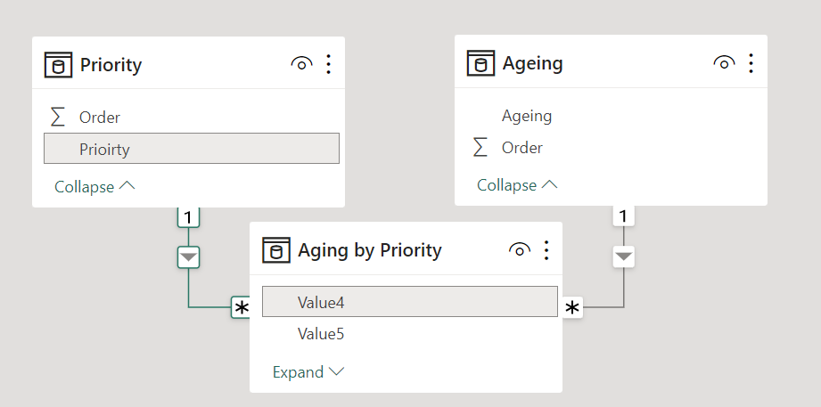 Ageing = SELECTCOLUMNS ( { ( "OK", 1 ), ( "Warning", 2 ), ( "Late", 3 ) }, "Ageing", [Value1], "Order", [Value2] )