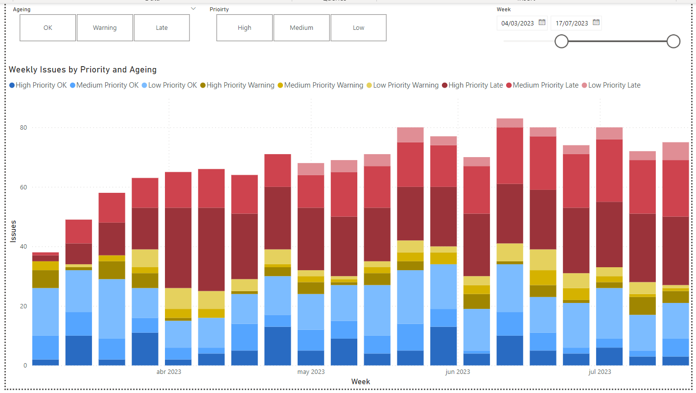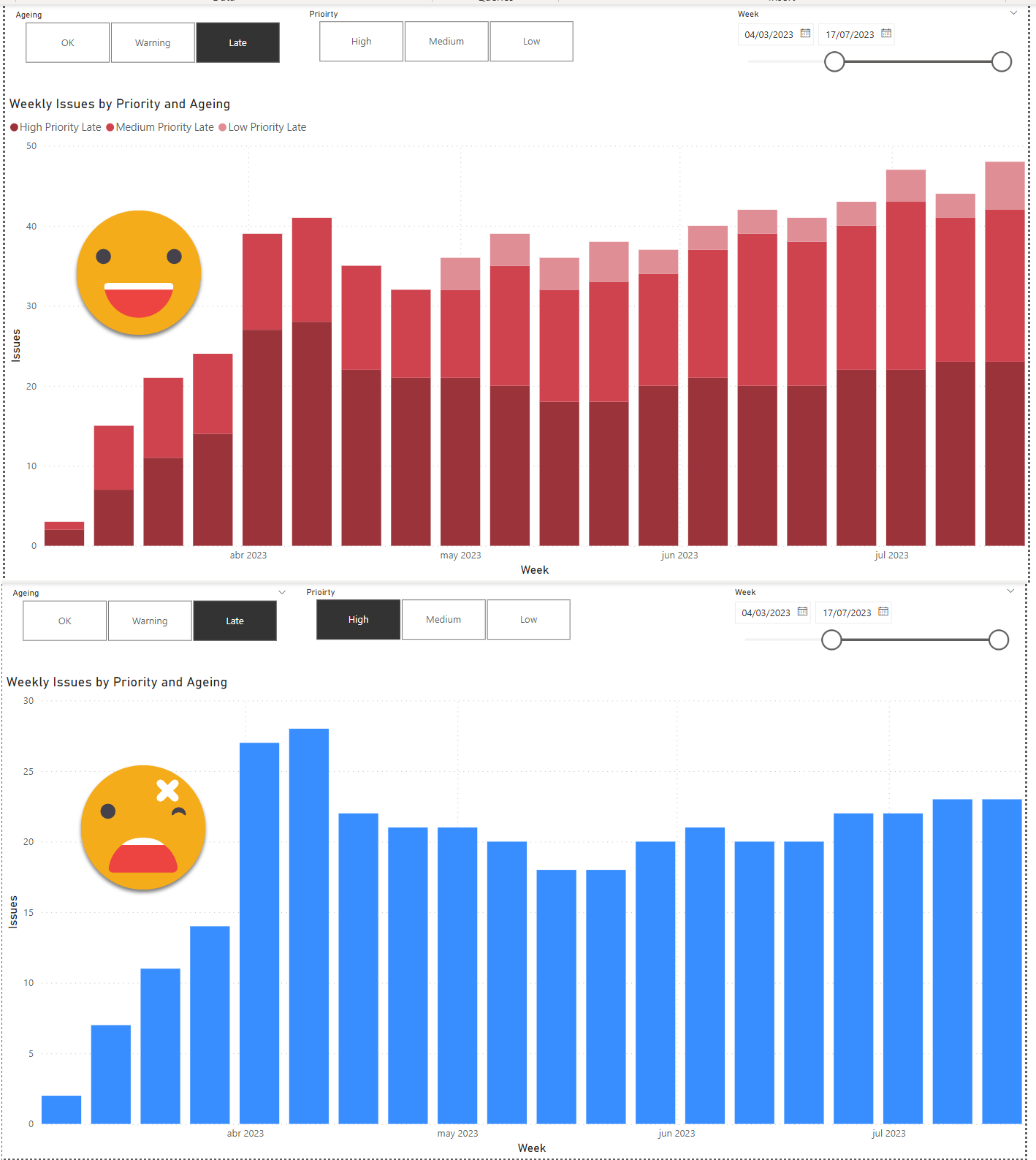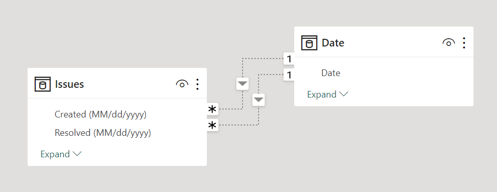 The simplified model looks like this. Issue table with creation and resolution date, as well as priority of the issue. Then a date table with a date column for «monday» of the week, which allows to have weekly aggregations and a continuous axis (so you don’t get that dreaded horizontal scroll bar). Since sometimes I want to check the created issues in the filter context, sometimes the resolved issues and sometime those «ongoing» I decided to have two inactive relationships between date and issues, and activate them only as needed.