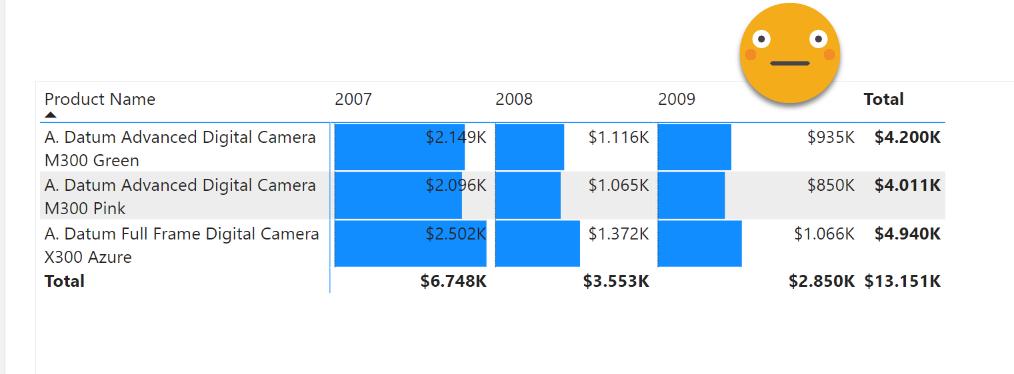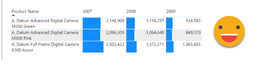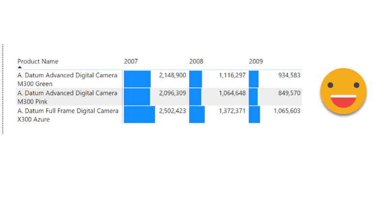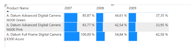 The starting point is a regular matrix where I’m showing 3 products and their sales amount in three different years. Indeed is not easy to read because bars overlap numbers, even though there’s plenty of space for both.