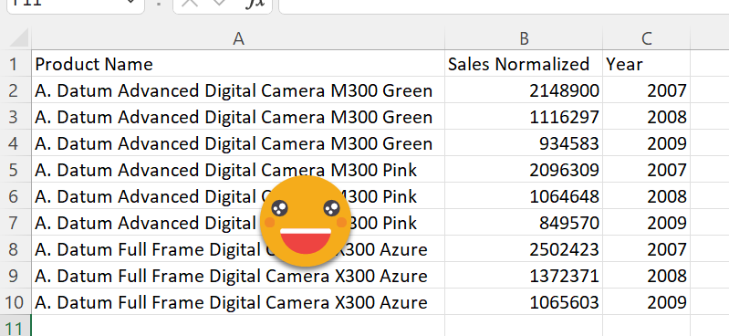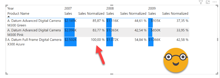 Sales Normalized = VAR currentValue = [Sales] VAR maxValue = CALCULATE ( MAXX ( CROSSJOIN ( VALUES ( 'Product'[Product Name] ), VALUES ( 'Date'[Year] ) ), [Sales] ), ALLSELECTED ( 'Product'[Product Name] ), ALLSELECTED ( 'Date'[Year] ) ) VAR normalizedSales = DIVIDE ( currentValue, maxValue ) RETURN IF ( currentValue <> BLANK (), normalizedSales )