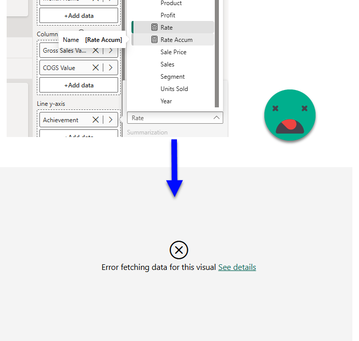 This week I experienced what happens when you replace a field in a visual. If you have the «On-Object Interaction» enabled (still in preview… not clear when it will go GA), for each field you get a right pointing arrow inviting you to replace it by something else.