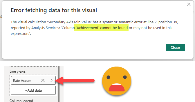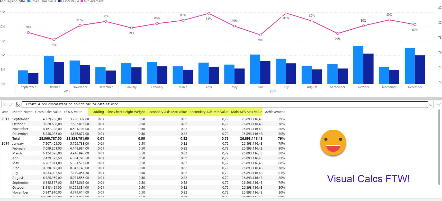 You show it to your boss and she says, «Can you make the line stay above the columns? I don’t like the overlap». Luckily you are aware of all the new features of Power BI and you know that you can have now Visual Calculations to define max and min values of axis. Let’s do it!