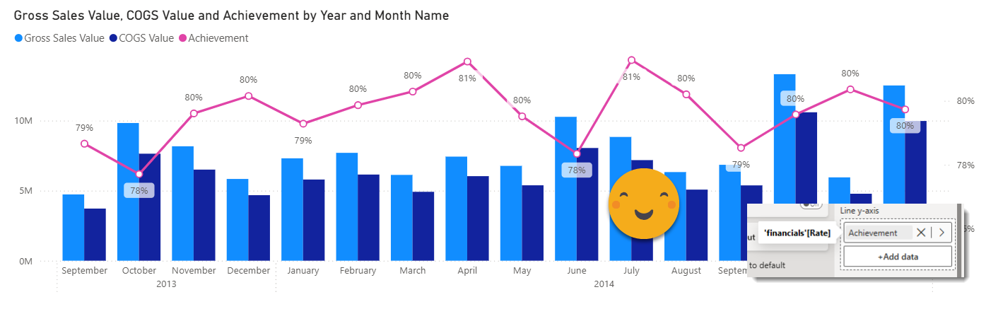 Padding = 0.01 Line Chart Height Weight = 0.5 Secondary Axis Max Value = EXPAND(MAXX(ROWS,[Achievement]),[Month Name],[Year])*(1+[Padding]) Secondary Axis Min Value = VAR lineMinVal = EXPAND(MINX(ROWS,[Achievement]),[Month Name],[Year])*(1-[Padding]) VAR lineHeight = [Secondary Axis Max Value] - lineMinVal VAR secondaryAxisHeight = lineHeight / [Line Chart Height Weight] VAR result = [Secondary Axis Max Value] - secondaryAxisHeight RETURN result Main Axis Max Value = VAR maxColumnValue = EXPAND(MAXX(ROWS,MAX([Gross Sales Value],[COGS Value])),[Month Name],[Year]) * (1+ [Padding]) VAR result = maxColumnValue / (1 - [Line Chart Height Weight] ) RETURN result
