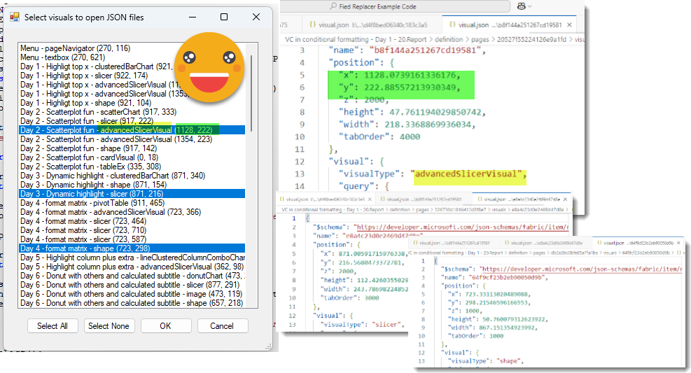 Just select the definition.pbir, select the visual or visuals, and off you go! It will open them in your default application. Using a quite large report by Erik Svensen where it shows so many use cases for visual calcs, it’s quite fun to use. The report can be downloaded here