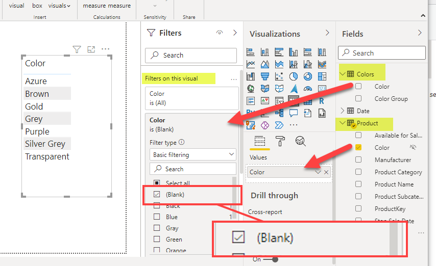 Unmapped Colors := CALCULATE ( COUNTROWS ( VALUES ( 'Product'[Color] ) ), ISBLANK ( Colors[Color] ) )