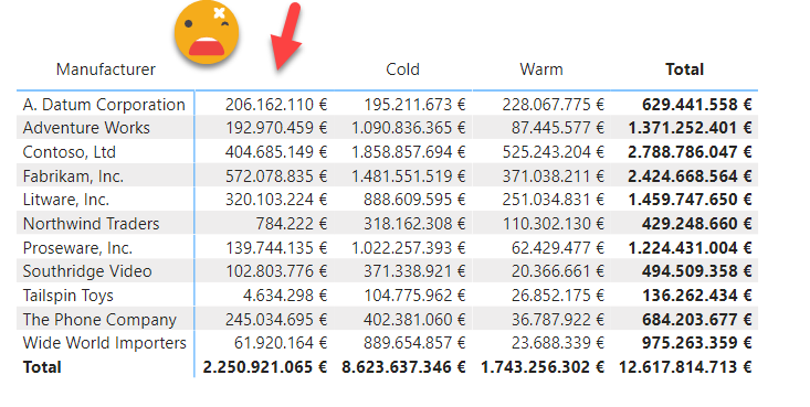 And now let’s imagine that during the refresh new colors appear in the Product table… If we are analyzing the share of products of warm and cold products we will get either a blank column or incorrect data (I’ve seen reports where this blanks are shamelessly hidden from the filter panel as people sometimes do not understand where they come from).