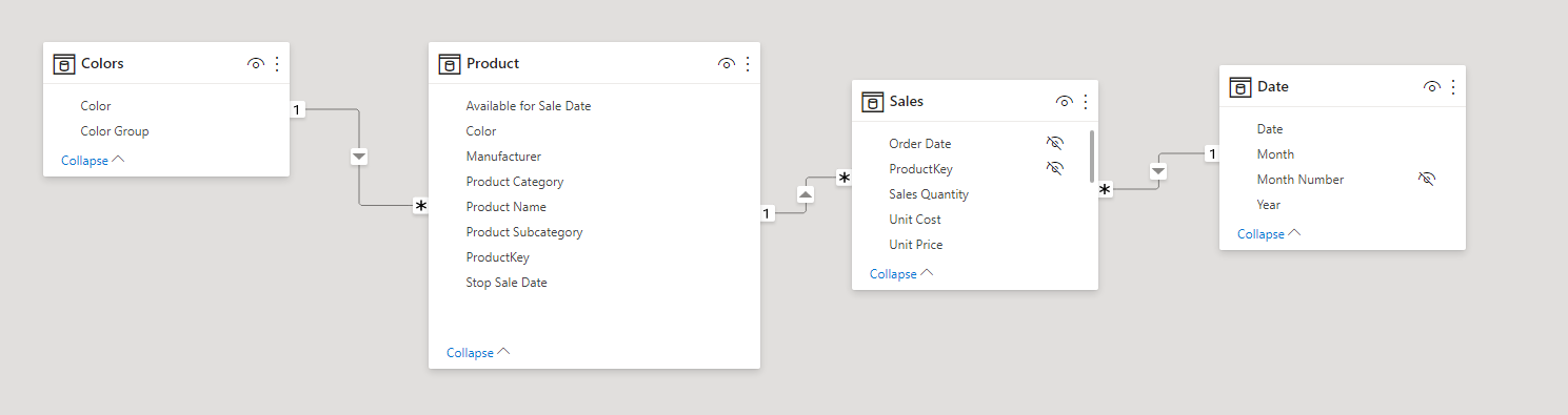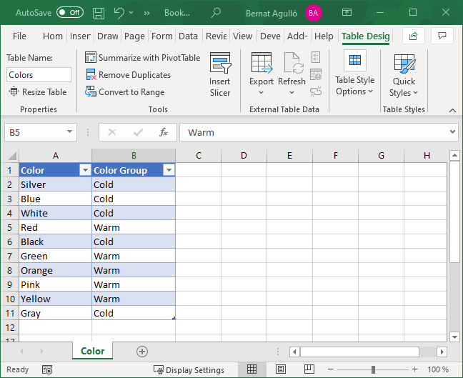 Let’s imagine we would like to group the colors of the products of the contoso model into warm and cold colors (according to our business-based criteria). Something like this (let’s imagine that these are all the colors present in the data when we set the table up):