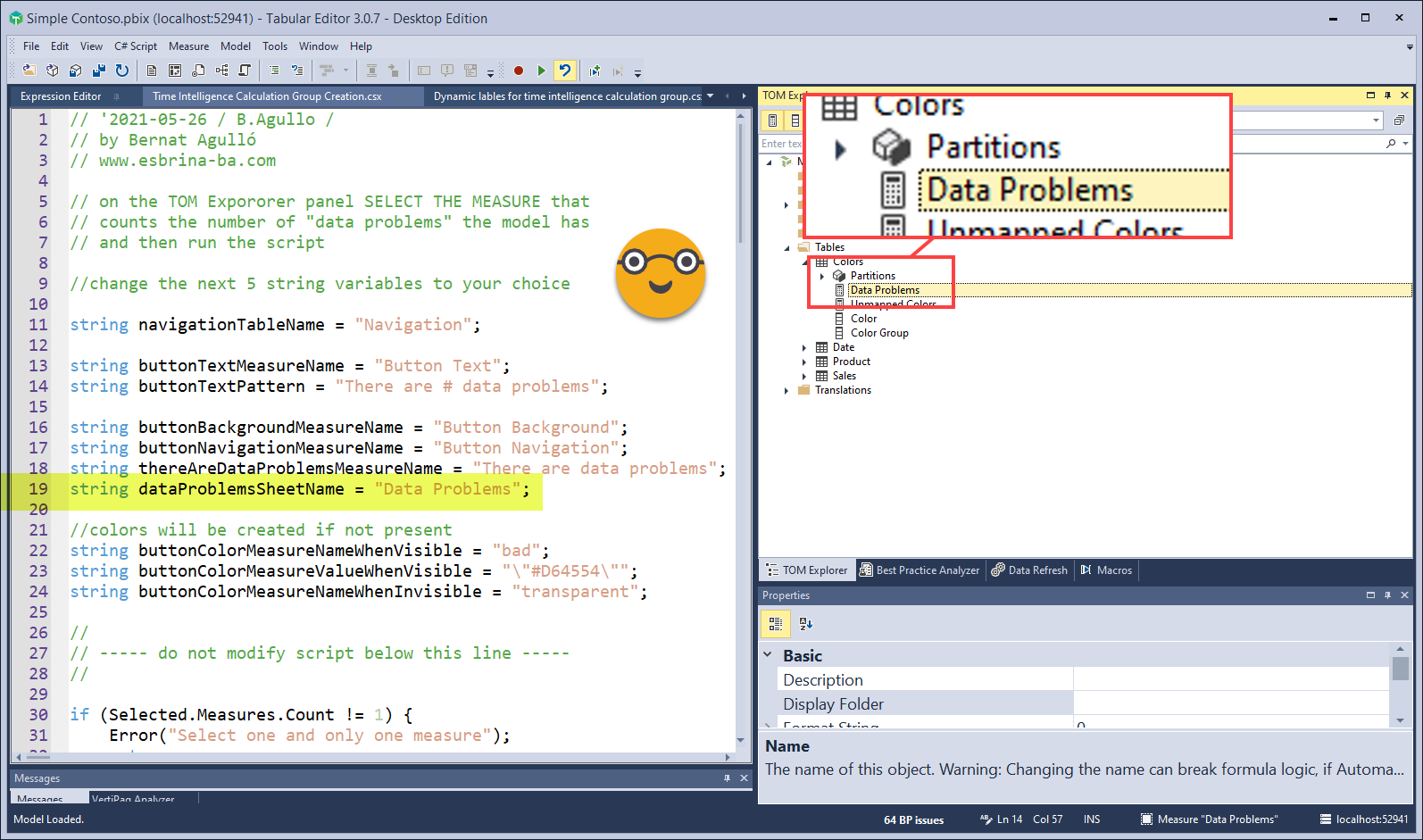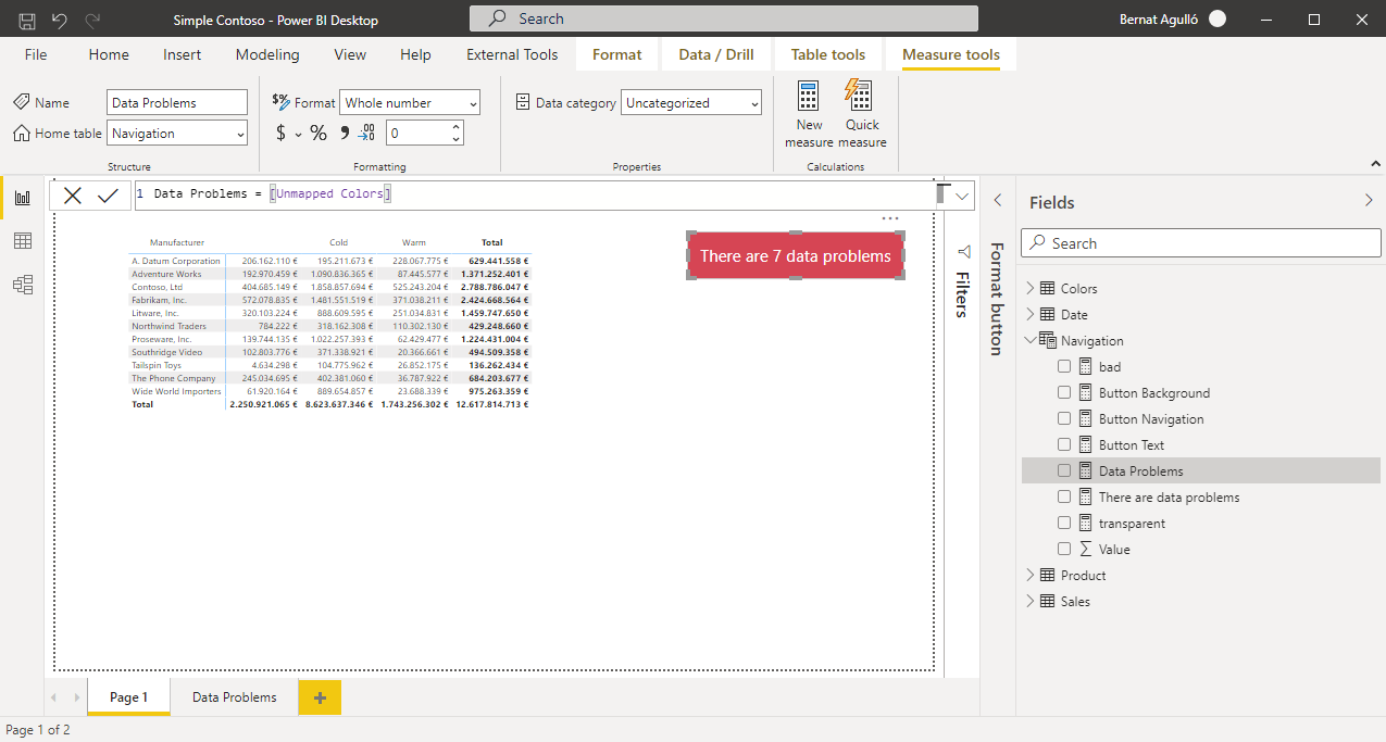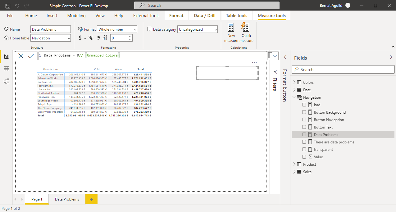Now is when the magic happens. If you checked out Patrick’s video, you’ll see we’ll need 4 measures to create the button, and they will be all the same for any report we create: «If there are data problems do this, otherwise do that». The perfect scenario for a c# script in Tabular Editor.