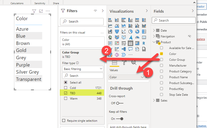 For the table we just (1) drag the color column from the product table (the only table with color column now) and (2) we use the «color group» in the filter-level visual