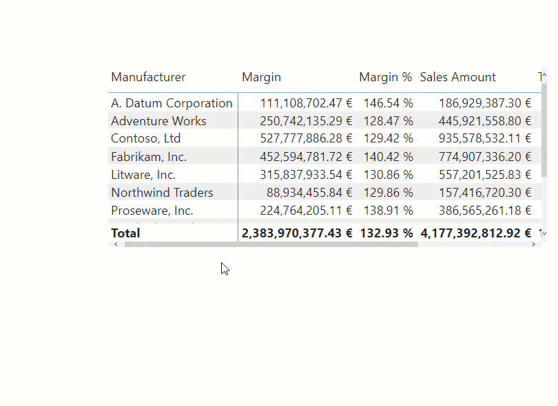 So now we only need to build a visual using the dynamic measure calculation group and see if we can bring the measure description on the tooltip. If you don’t have it yet into your toolbelt, go grab the script and add it to your macros/quick actions. We go ahead and create a dynamic measure calc group for the famous 4 measures: Sales Amount, Total Cost, Margin, Margin %.