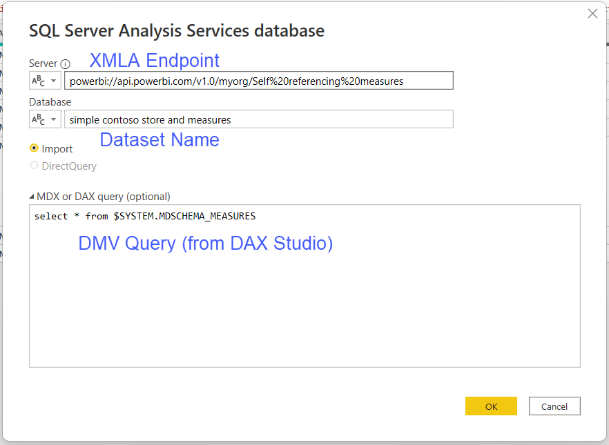 However, can I have this as a data source referring to the some model?! Turns out that you can if you are using premium, as your analysis service instance is accessible through XMLA endpoint. You just need to select SQL Server Analysis Services database as a data source, and fill it with your XMLA endpoint, dataset name and DMV the query we just used in DAX studio. If you are not in premium just export it and load it as a new datasource. Or just write your measure definitions table from scratch in an excel file, your choice.