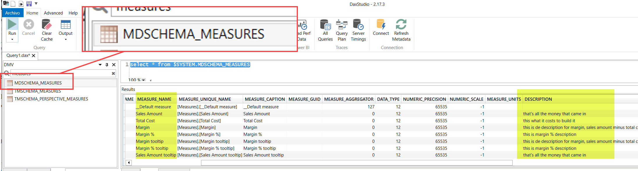 Now, how can I bring the measure description?! I knew that there is a DMV tab in DAX studio that allow you to extract metadata from your model. I checked and indeed, MDSCHEMA_MEASURES seem to have what I needed. I typed first some measure descriptions in Tabular Editor for the measures (although this can be done in the model view inside PBID), save back the model, run the MDSCHEMA_MEASURES query in dax studio and voilà!