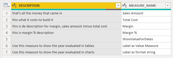 After that I just removed the «default measure» thing, and selected the only two columns I need, measure name and measure description.