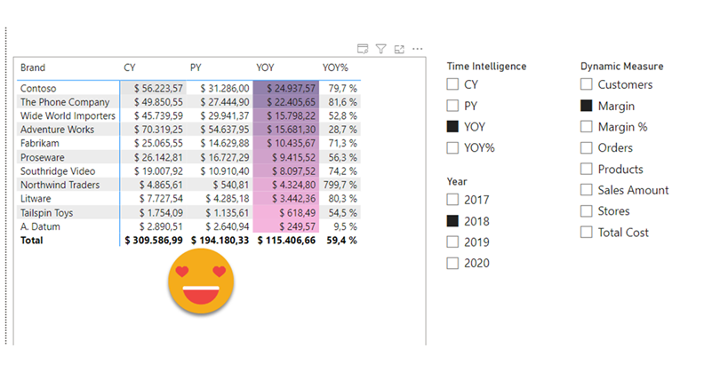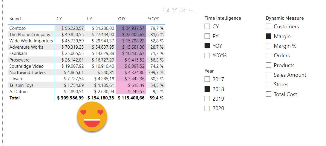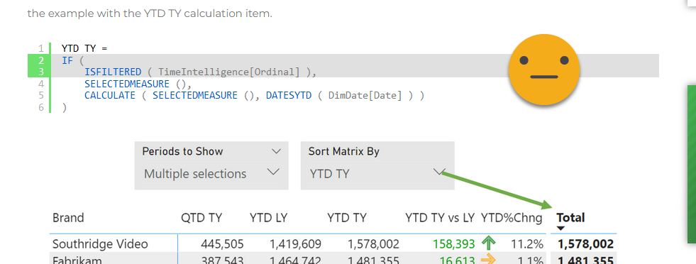 Basically we check if we are at the total row or not with one variable, then we get the calculation item *name* we need to use for sorting from the disconnected slicer, providing a default one if none is selected. And then we do the actual calculation. If we are in the total row, apply the chosen calculation item to the selected measure, otherwise leave things as you found them. And that's pretty much it.
