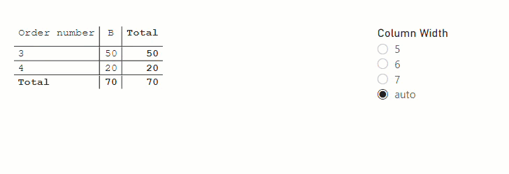 Now you may think I already over-stretched the topic, but maybe we can do one more thing. What if we added an «auto» in the slicer, so that it would make all the columns the same, but only wide enough to show the values it needs to show. With some more DAX, we can have the auto-mode. Instead of getting the number hard-coded or from the calc-item name (which is also quite hard-coded), we could find the largest value in the visual and then measure its length. We can then decide if we want some padding or just wide enough for all numbers to show, your choice. To do that, the dax for the format string expression looks like this