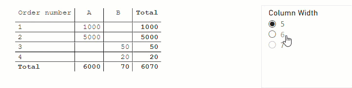 5 (format string expression) = VAR currentValue = SELECTEDMEASURE () VAR currentLength = LEN ( CONVERT ( currentValue, STRING ) ) VAR selectedLength = CONVERT ( SELECTEDVALUE ( 'Column Width'[Column Width], currentLength ), INTEGER ) VAR extraSpaces = IF ( selectedLength > currentLength, selectedLength - currentLength, 0 ) VAR prefix = REPT ( UNICHAR ( 0160 ), extraSpaces ) RETURN """" & prefix & """" & SELECTEDMEASUREFORMATSTRING ()