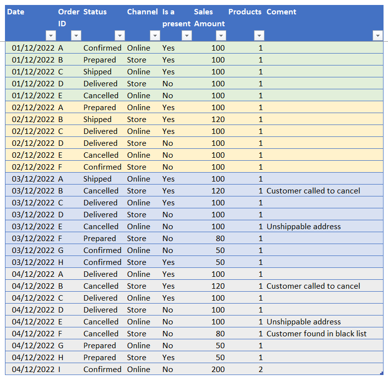 So here we see that in the filter context Online + Prepared + Last Snapshot we have 50 (€?) and apparently we had nothing on day 1. This 50 come from Order ID = "G". Yet we can see that there has been Ins worth 150 and outs worth -100. If we Ctrl+click on Ins (otherwise the initial filter is lost) we can see that order A was also in this same situation at some point. Checking at the bottom table that is not there anymore because it has advanced to the next status. Isn't that cool? That's some powerful storytelling on what happened with the orders.